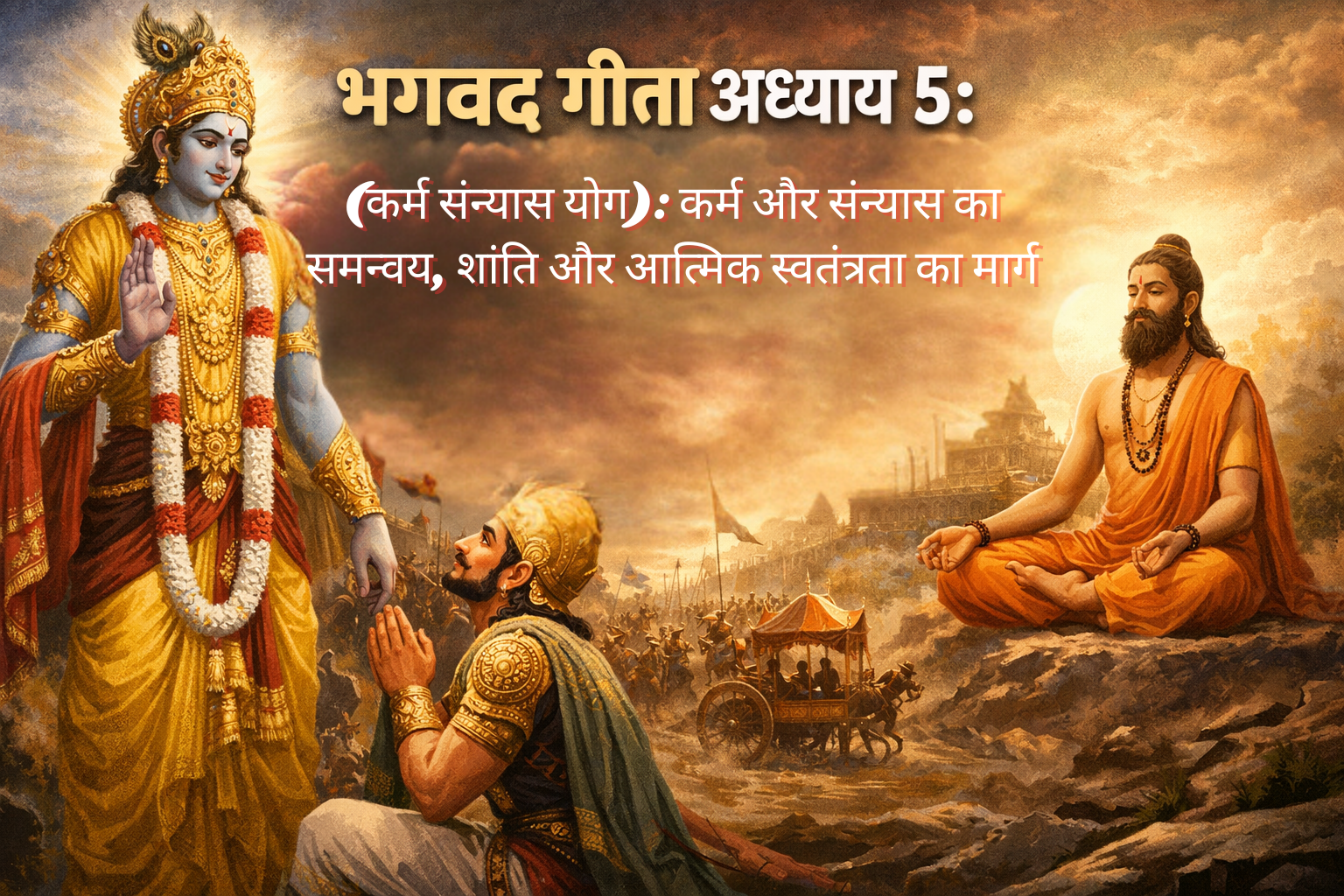 भगवद गीता अध्याय 5: कर्म संन्यास योग एक गहरा और अत्यंत व्यावहारिक अध्याय है। यह हमें सिखाता है कि सच्चा संन्यास बाहरी क्रियाओं का त्याग नहीं, बल्कि आंतरिक आसक्ति का त्याग है। यह हमें कर्म और संन्यास में अंतर को स्पष्ट रूप से समझाता है और यह बताता है कि सच्चा संन्यासी कौन है—वह व्यक्ति जो कर्म करते हुए भी अकर्ता भाव रखता है, फल की इच्छा से मुक्त है, और सभी में समदृष्टि रखता है।