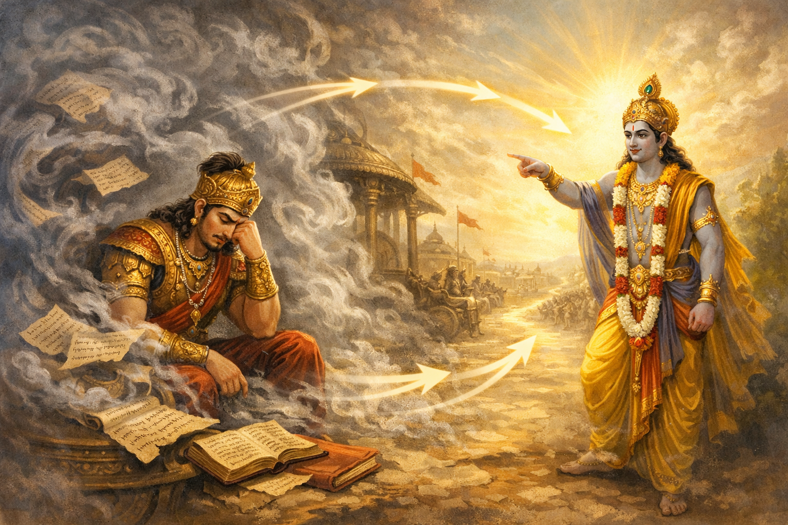 युद्धभूमि में, अपने स्वजनों को सामने देखकर अर्जुन गहरे असमंजस में पड़ गए थे। उन्होंने सोचा कि यदि वे युद्ध करके विजय प्राप्त भी कर लेते हैं, तो उसका क्या लाभ जब उन्हें अपने ही लोगों का रक्त बहाना पड़े? उन्होंने ज्ञान मार्ग को श्रेयस्कर मानते हुए कर्म (युद्ध) से विमुख होने की इच्छा व्यक्त की। उनका भ्रम था कि कर्म का त्याग करके ही शांति और मोक्ष प्राप्त किया जा सकता है। यह 'अर्जुन का कर्म और ज्ञान के बीच भ्रम' आज भी कई लोगों के मन में होता है। हम सोचते हैं कि यदि हम सांसारिक जिम्मेदारियों को छोड़ दें, तो हमें आध्यात्मिक शांति मिलेगी।