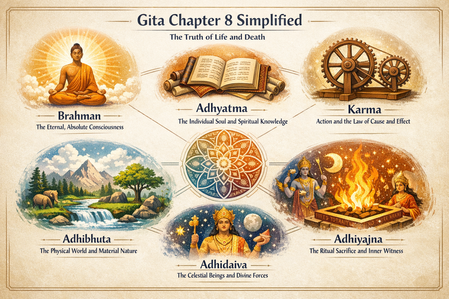 ब्रह्म, अध्यात्म, कर्म, अधिभूत, अधिदैव, अधियज्ञ: श्रीकृष्ण इन छह मूलभूत तत्त्वों की स्पष्ट परिभाषा देते हैं, जो सृष्टि और जीव के संबंधों को समझने के लिए आवश्यक हैं।