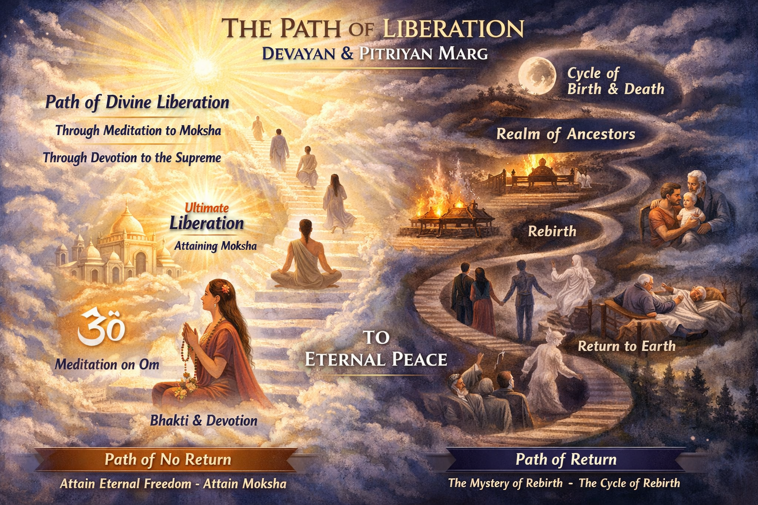 देवयान और पितृयान मार्ग: भगवद गीता अध्याय 8 दो मुख्य मार्गों का वर्णन करता है—शुक्ल मार्ग (देवयान) जो मोक्ष की ओर ले जाता है, और कृष्ण मार्ग (पितृयान) जो पुनर्जन्म का रहस्य खोलता है।