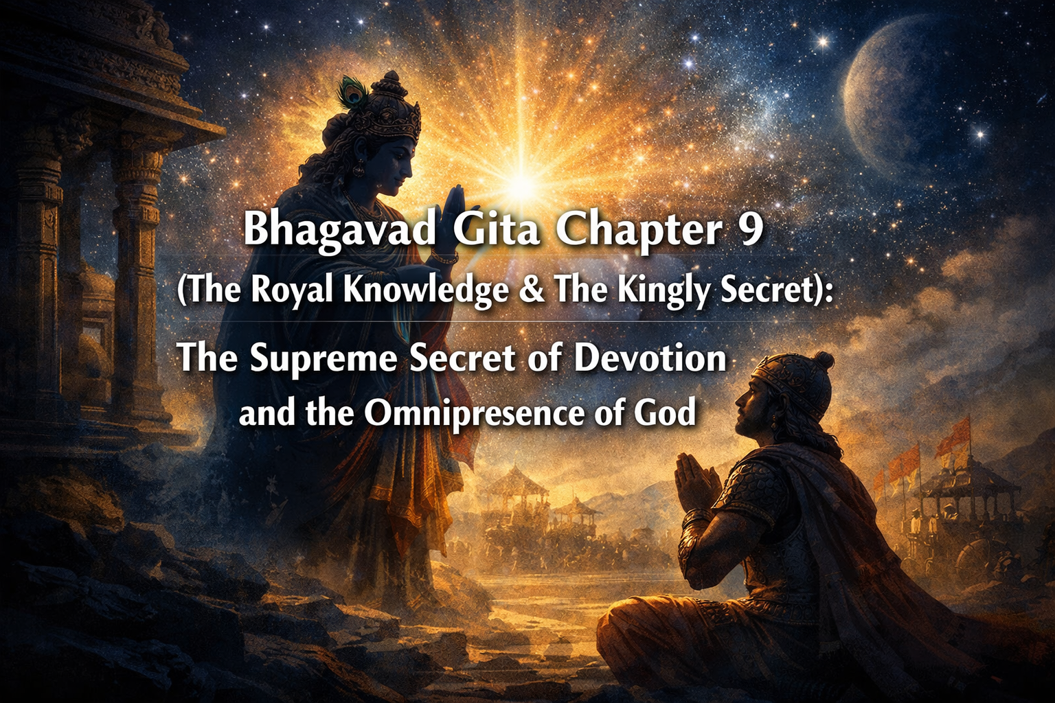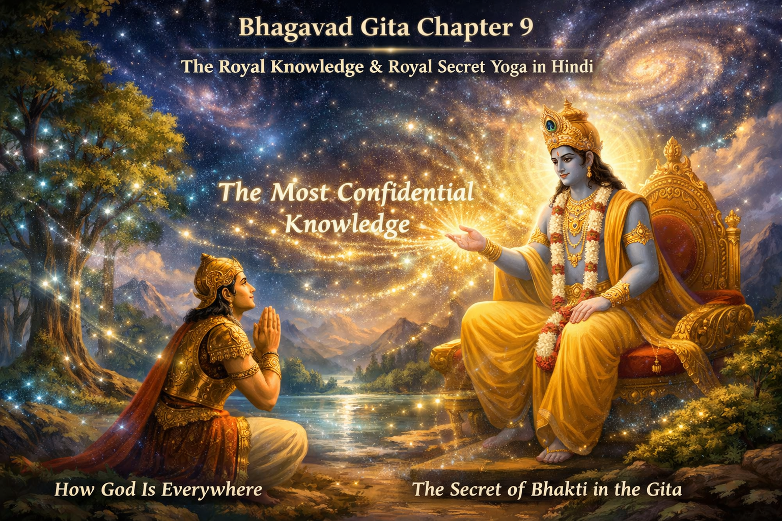 परम गोपनीय ज्ञान: अध्याय 9 भगवान श्रीकृष्ण द्वारा प्रदान किया गया सबसे रहस्यमय और महत्वपूर्ण ज्ञान है, जो उनकी सर्वव्यापकता और दिव्यता को प्रकट करता है।