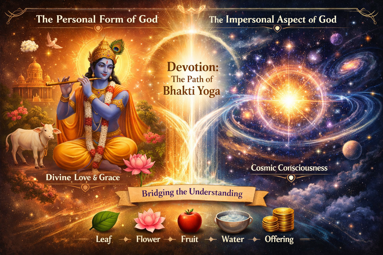 ईश्वर की सर्वव्यापकता और स्वरूप: श्रीकृष्ण स्वयं को समस्त सृष्टि का आधार बताते हैं, जो निराकार और साकार दोनों रूपों में व्याप्त हैं, फिर भी उनसे परे और निर्लिप्त रहते हैं।