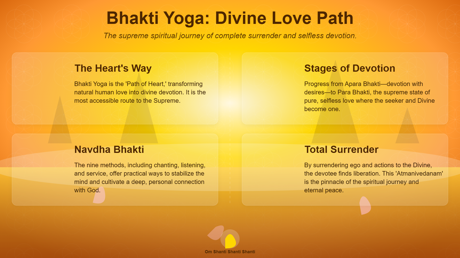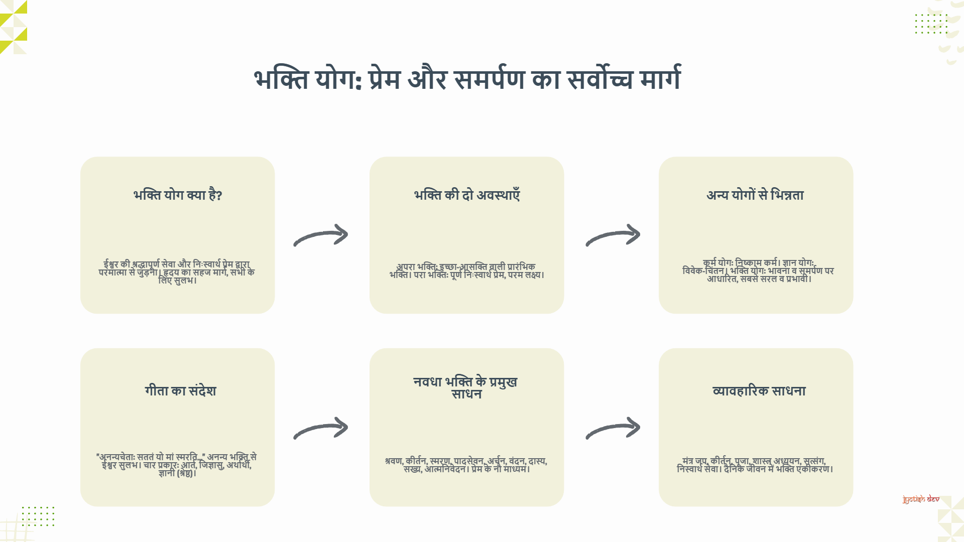 भक्ति योग कोई पलायनवादी या निष्क्रिय साधना नहीं है। यह एक सक्रिय, जीवंत और परिवर्तनकारी प्रक्रिया है जो व्यक्ति के हृदय से स्वार्थ और विषाद को हटाकर प्रेम और आनंद से भर देती है। यह मार्ग यह शिक्षा देता है कि ईश्वर दूर किसी स्वर्ग में नहीं, बल्कि हमारे हृदय में और हमारे चारों ओर विद्यमान है। प्रेम ही वह सार्वभौमिक धागा है जो हमें उस परम स्रोत से जोड़ता है।