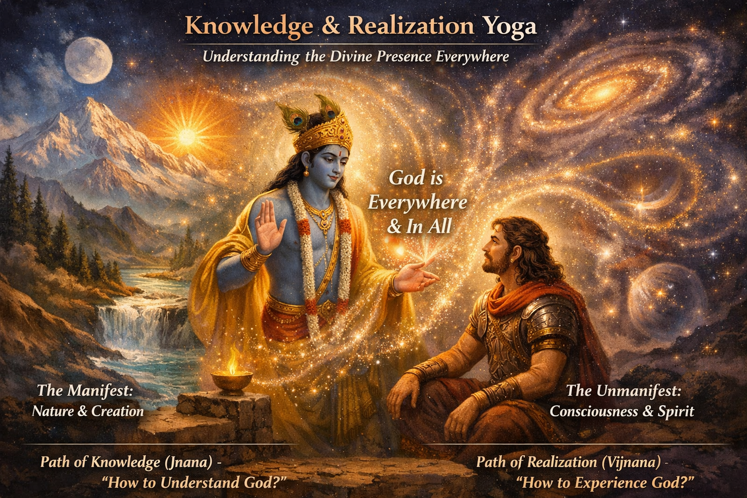 श्रीकृष्ण अर्जुन से कहते हैं कि वे अब उसे अपना संपूर्ण ज्ञान, विज्ञान सहित बताएँगे, जिसे जानने के बाद संसार में कुछ भी जानना शेष नहीं रहेगा [1]। यह एक महत्वपूर्ण घोषणा है, क्योंकि यह बताता है कि ईश्वर-ज्ञान ही समस्त ज्ञान का सार है। जैसे ही अर्जुन ने कुरुक्षेत्र के युद्धभूमि में अपने मन की शांति खो दी थी, उसे अब इस गहरे आध्यात्मिक ज्ञान की आवश्यकता थी, जो उसे हर संदेह से ऊपर उठा सके। यह ज्ञान केवल दार्शनिक नहीं, बल्कि अस्तित्व के मूलभूत प्रश्नों का समाधान है।