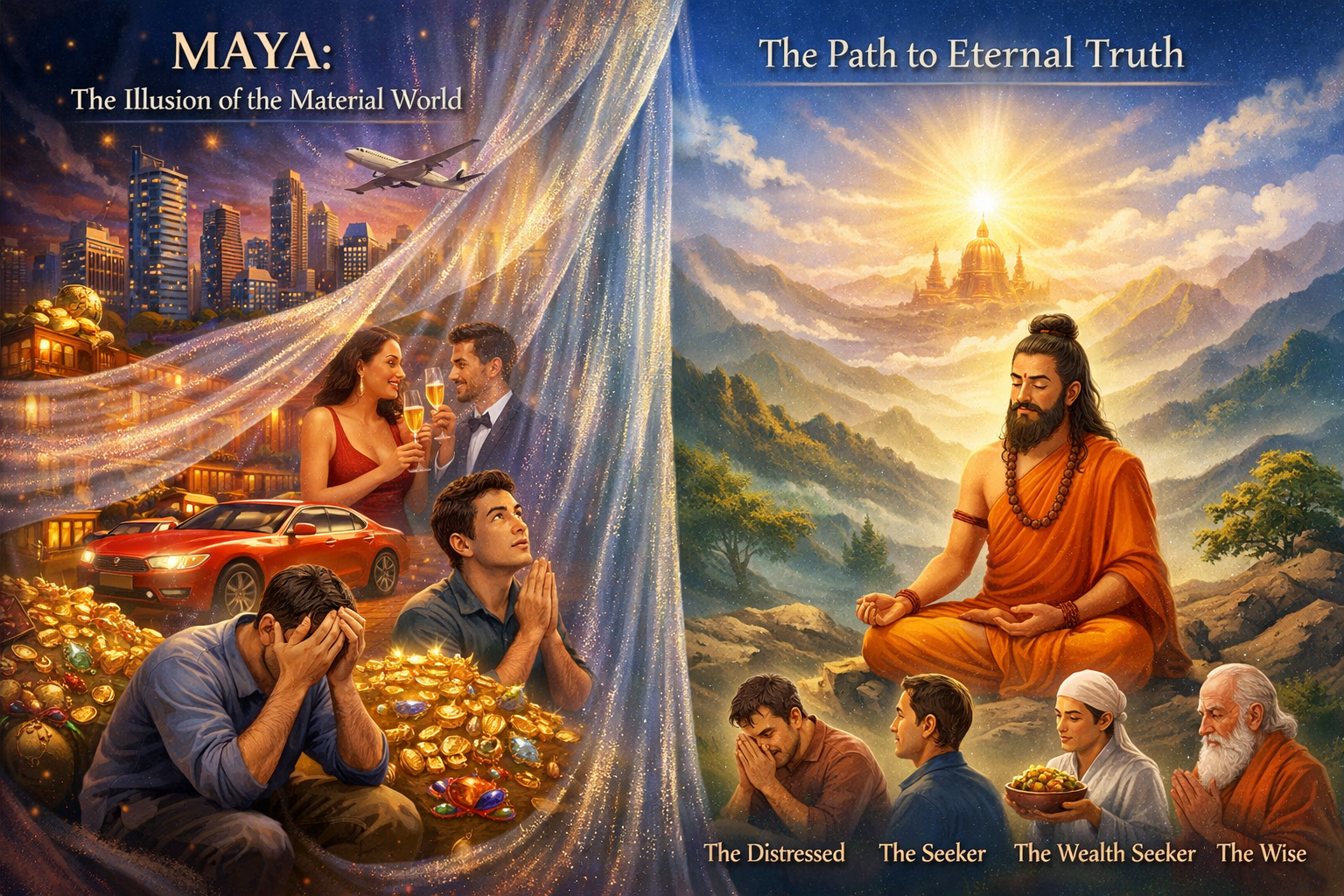 माया का गूढ़ रहस्य: माया ईश्वर की दिव्य ऊर्जा है जो हमें भ्रमित करती है, जिससे हम ईश्वर के वास्तविक स्वरूप को नहीं देख पाते। इस माया को केवल ईश्वर की शरण लेकर ही पार किया जा सकता है।