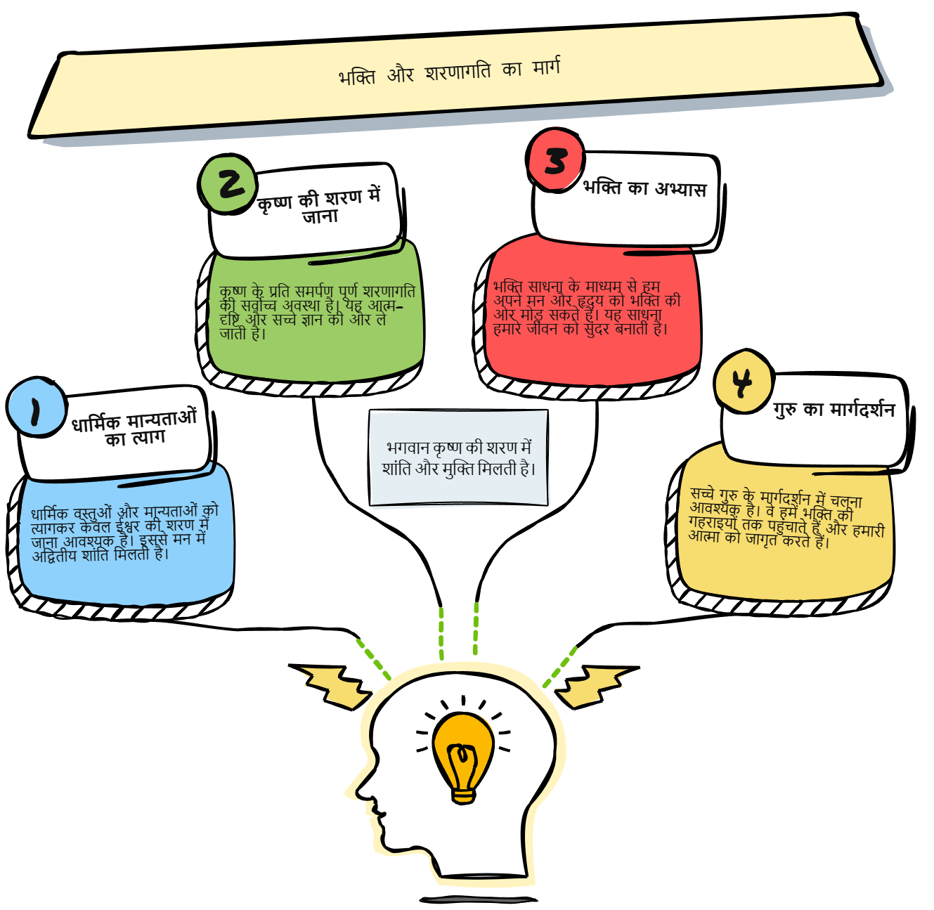 शरणागति का केंद्रीय सिद्धांत: यह भक्ति का सार है, जहाँ व्यक्ति अपनी सभी मानसिक कल्पनाओं, स्वनिर्मित नियमों और अहंकारपूर्ण तर्कों का त्याग कर सीधे ईश्वर की इच्छा के समक्ष समर्पित हो जाता है।